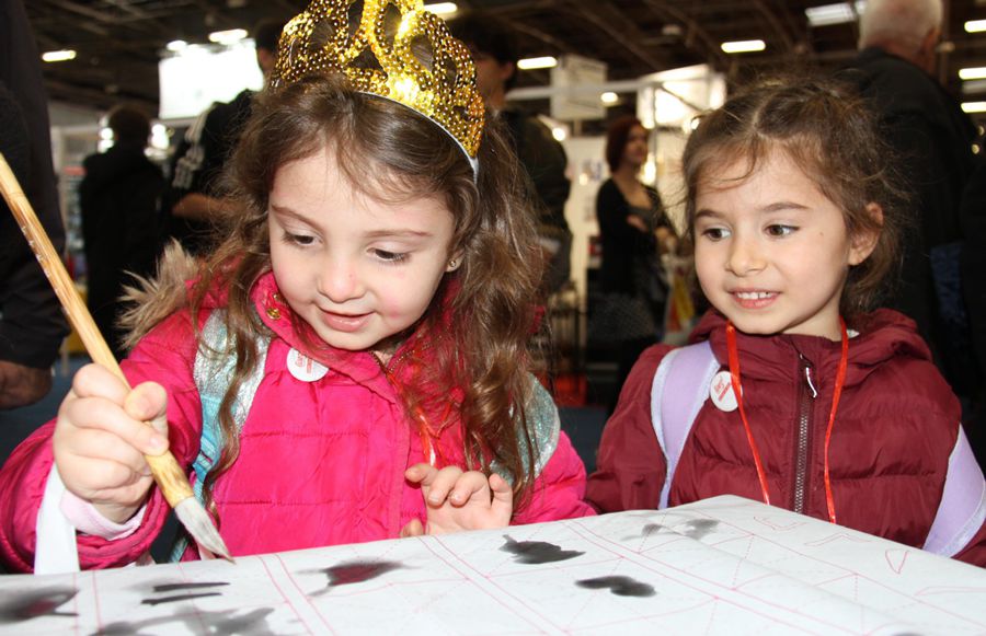 A little girl tries Chinese calligraphy at the Chinese exhibition area of the 2019 Paris book fair in Paris, capital of France, on March 15, 2019. [Photo/Xinhua]