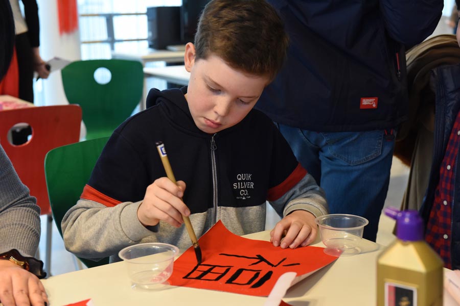 A French child writes the Chinese character for fu (happiness) with a calligraphy brush at the China Cultural Center in Paris, Jan 26, 2019. [Photo/Chinaculture.org]