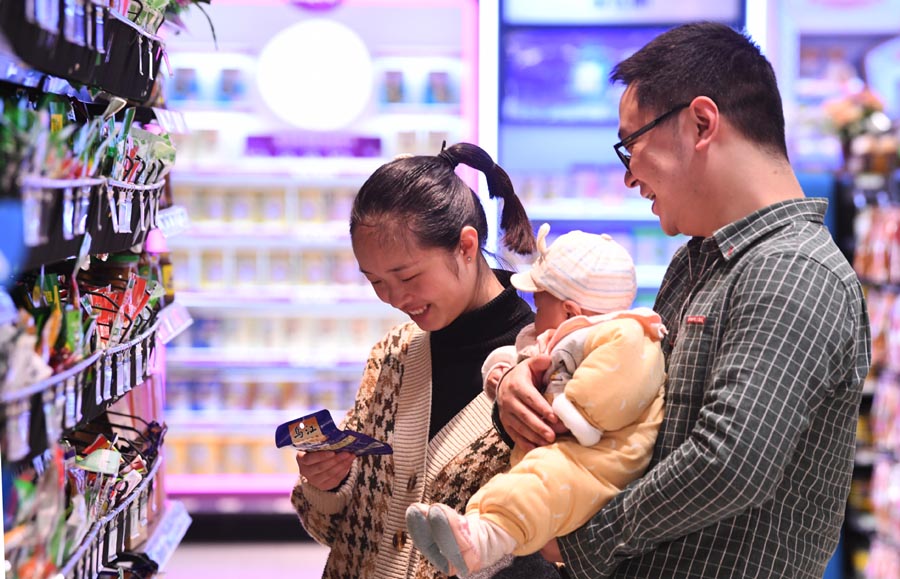 People look at packaged pickles at a supermarket in Chongqing, March 20, 2019. [Photo/Xinhua]