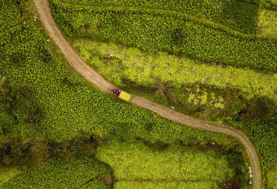 An aerial photo of a motorbike loaded with fresh stem mustard running through a farm in Guangfu village, Baosheng township, in Fuling, Southwest China's Chongqing, Feb 21, 2019. Stem mustard is widely used to make pickles in China. [Photo/Xinhua]