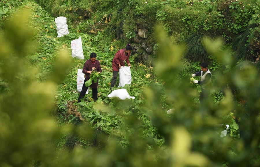 Farmers collect fresh stem mustard in Guangfu village of Fuling in Chongqing, Feb 21, 2019. [Photo/Xinhua]
