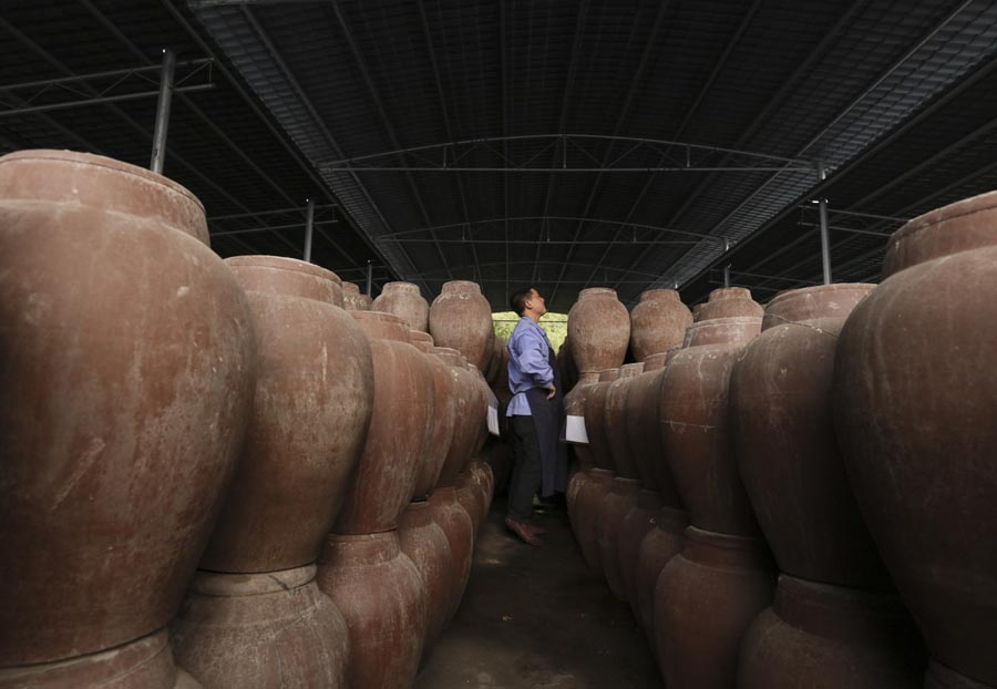 A worker checks pickle jars at a production workshop in Fuling, Chongqing, Feb 21, 2019. [Photo/Xinhua]