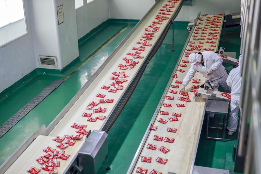 People work on a production line at a pickle factory in Chongqing, Feb 22, 2019. [Photo/Xinhua]
