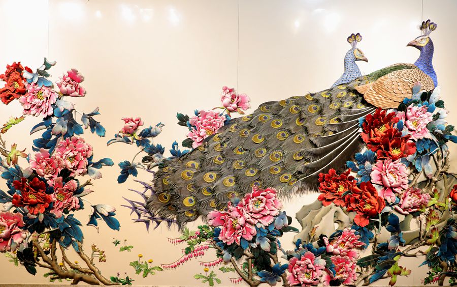 A treasured cloth paste painting of Fengning Manchu autonomous county, North China's Hebei province, is showcased on March 27, 2019. [Photo by Fu Rui/chinadaily.com.cn]