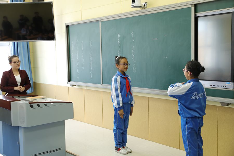 A demonstration class is held in a local primary school on March 27, 2019, in Fengning Manchu autonomous county, Hebei province. The teacher asks student to communicate in Manchu script. [Photo by Fu Rui/chinadaily.com.cn]