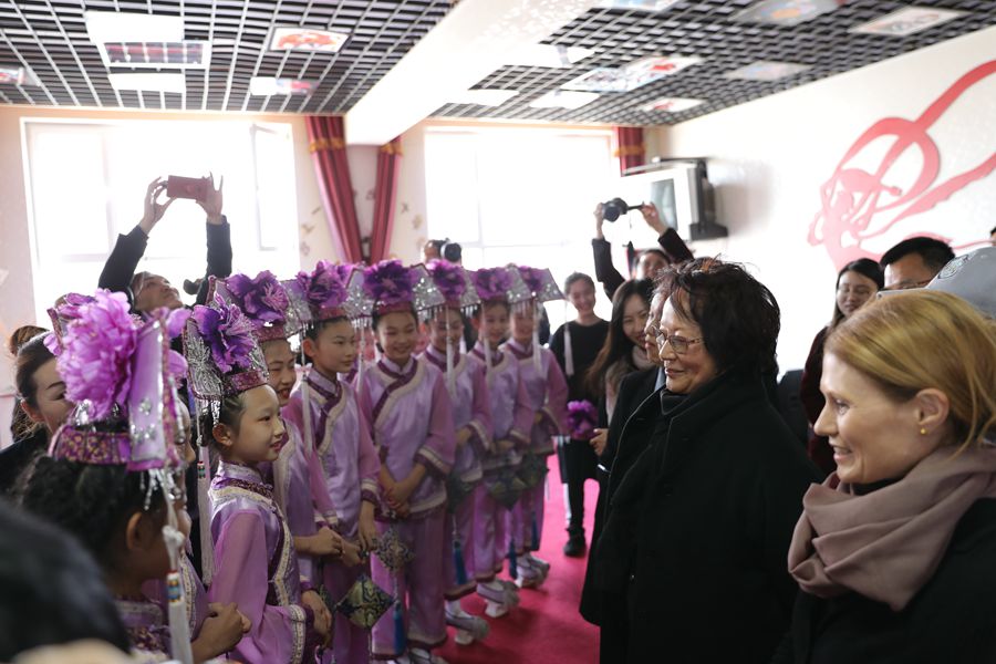Children in traditional Manchu clothing talk with foreign experts in English on March 27, 2019, in Fengning Manchu autonomous county, Hebei province. [Photo by Fu Rui/chinadaily.com.cn]