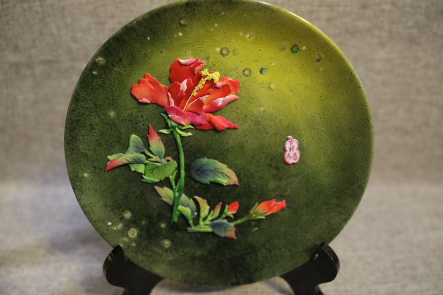 A cloth paste painting on a plate pictured on March 28, 2019. [Photo by Fu Rui/chinadaily.com.cn]