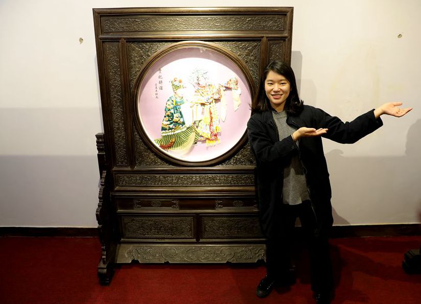 Kim Dongdae, director of the World Heritage Team, poses with a cloth paste painting on March 27, 2019, in Fengning Manchu autonomous county, Hebei province. [Photo by Fu Rui/chinadaily.com.cn]
