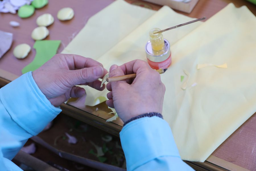A craftsman is gluing together colored cloths and stuffing, which is a vital step in making cloth paste paintings, on March 27, 2019, in Fengning Manchu autonomous county, Hebei province. [Photo by Fu Rui/chinadaily.com.cn]