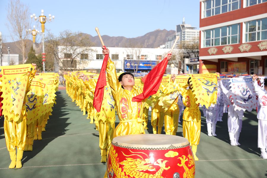 Local primary students present the momentum of Eight Banners (military-administrative organizations of the Man nationality in the Qing Dynasty) on March 27, 2019, in Fengning Manchu autonomous county, Hebei province. [Photo by Fu Rui/chinadaily.com.cn]