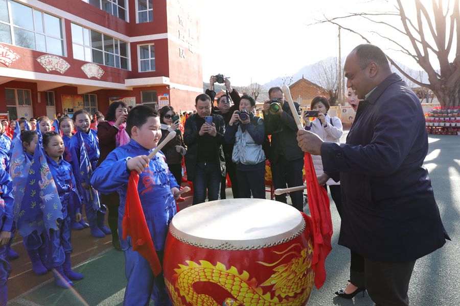 Sipiriano Ranuku, UNESCO facilitator for intangible cultural heritage, beats a battle drum with a student on March 27, 2019, in Fengning Manchu autonomous county, Hebei province. [Photo by Fu Rui/chinadaily.com.cn]