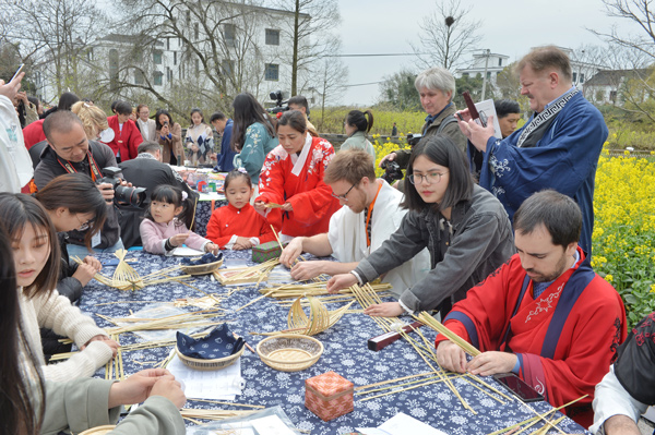 Locals join a group of foreigners for bamboo weaving in Tongxiang city, East China's Zhejiang province, March 31, 2019. [Photo by Li Jin/chinadaily.com.cn]