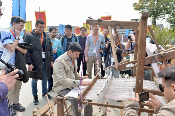 A foreigner tries out silk weaving on a loom in Tongxiang city, East China's Zhejiang province, March 30, 2019. [Photo by Chen Weimin/chinadaily.com.cn]