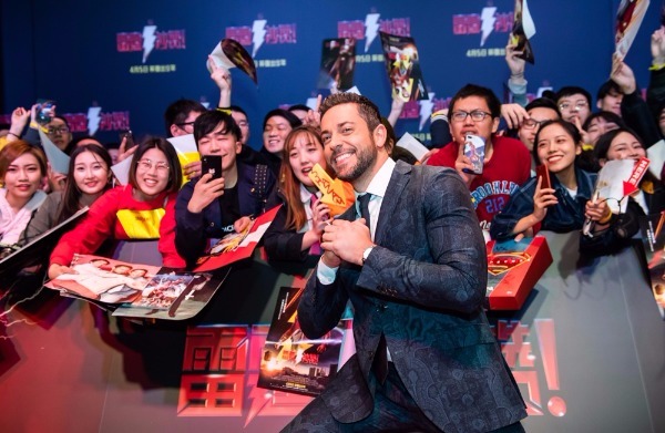 Zachary Levi (center) promotes the film with enthusiastic Chinese fans during his Beijing tour on March 25.[Photo provided to China Daily] |