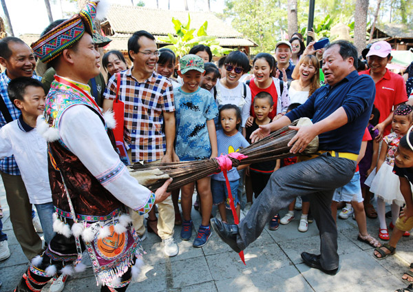 A visitor plays a traditional game with a performer of the Miao ethnic group at a park in Liuzhou, Guangxi Zhuang autonomous region, during the National Day holidays last year. [PHOTO BY?LONG TAO/FOR CHINA DAILY] |