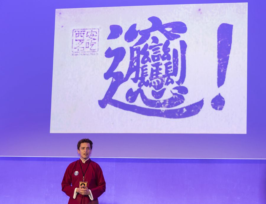 Ahmad Elmouniery performs during the "Chinese Bridge" Chinese Proficiency Competition for Foreign College Students UK Regional Final in London, Britain, April 6, 2019. [Photo/Xinhua]