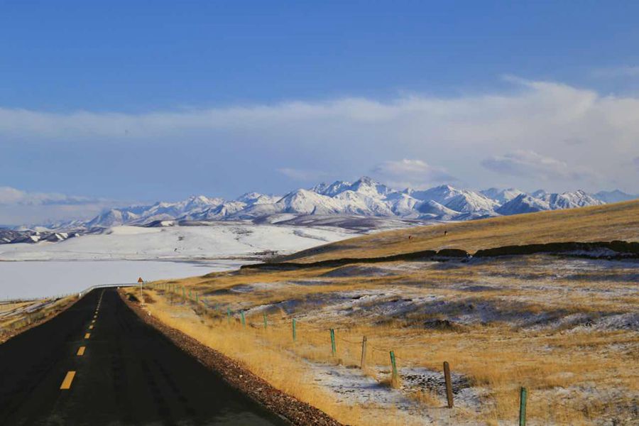 A road offers a dark contrast to the fresh fallen snow and grasslands at Shandan Horse Farm Grassland in Northwest China's Gansu province on April 8, 2019. [Photo by Wang Chao/provided to chinadaily.com.cn]