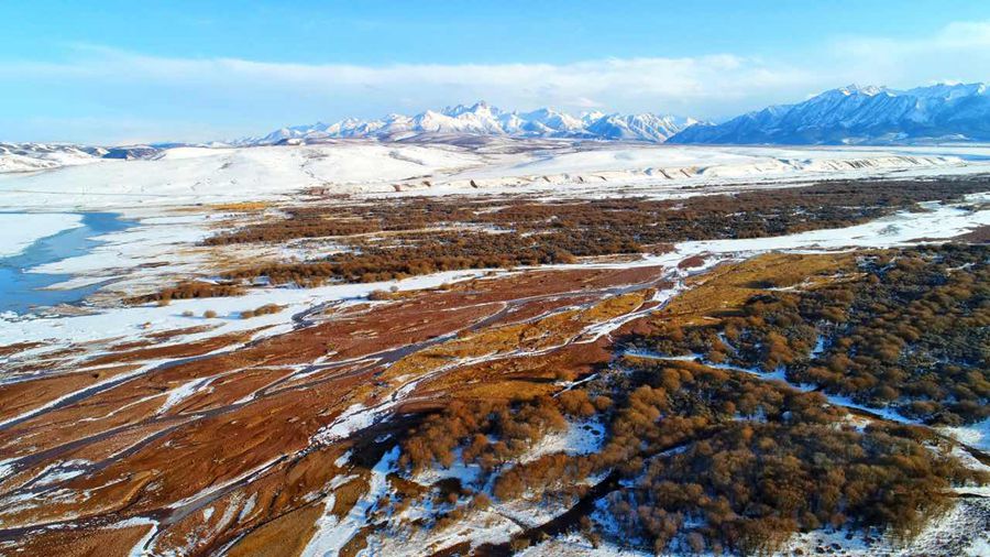 Snow covers the grassland in the distance while frosted rivers and streams break up the landscape following a spring snowfall at Shandan Horse Farm Grassland in Northwest China's Gansu province on April 8, 2019. [Photo by Wang Chao/provided to chinadaily.com.cn]