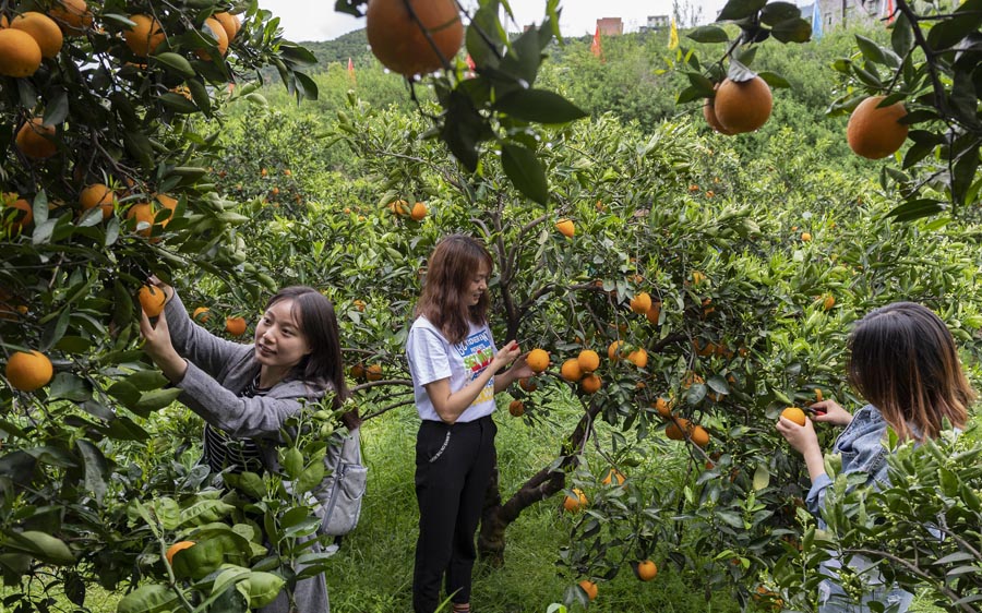 Picking fresh fruits has become a popular attraction for city dwellers looking to experience countryside lifestyle and catch some fresh air. Tourists pick oranges during spring harvest season in Wangling village, Zigui county, Yichang city in Central China's Hubei province, on April 9, 2019. [Photo/Xinhua]