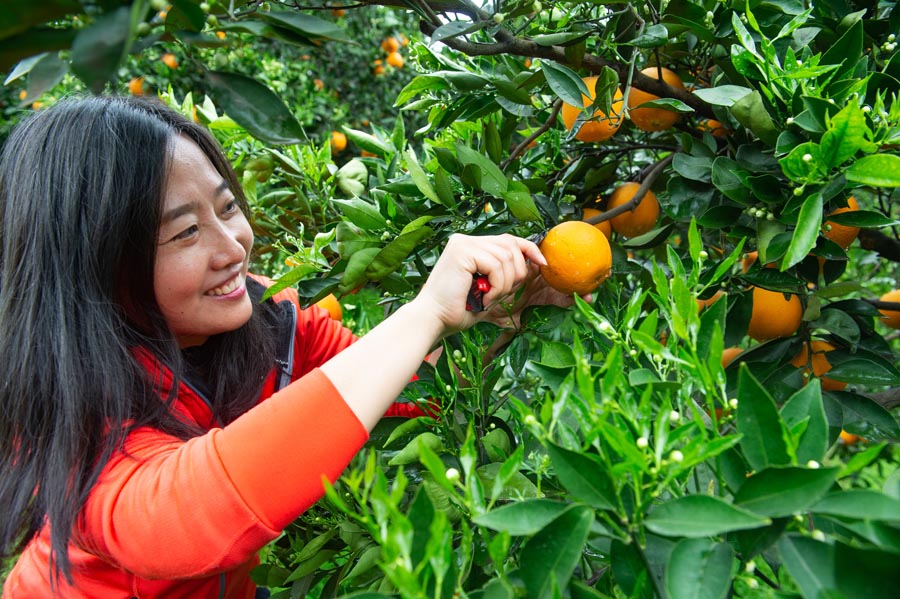 A tourist picks oranges at a farm in Wangling village, Zigui county in Central China's Hubei province on April 9, 2019. The county is developing orange planting business to boost local tourism and economy. [Photo/Xinhua]