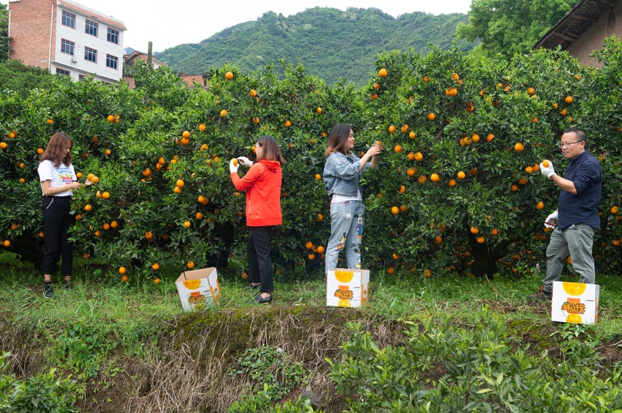 Tourists pick oranges during spring harvest season in Wangling village, Zigui county, Yichang city in Central China's Hubei province, on April 9, 2019. [Photo/Xinhua]