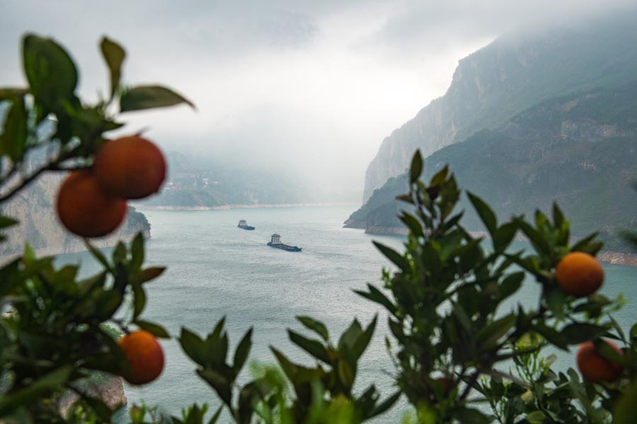 Boats navigate a river near an orange farm in Zigui county, April 9, 2019. [Photo/Xinhua]