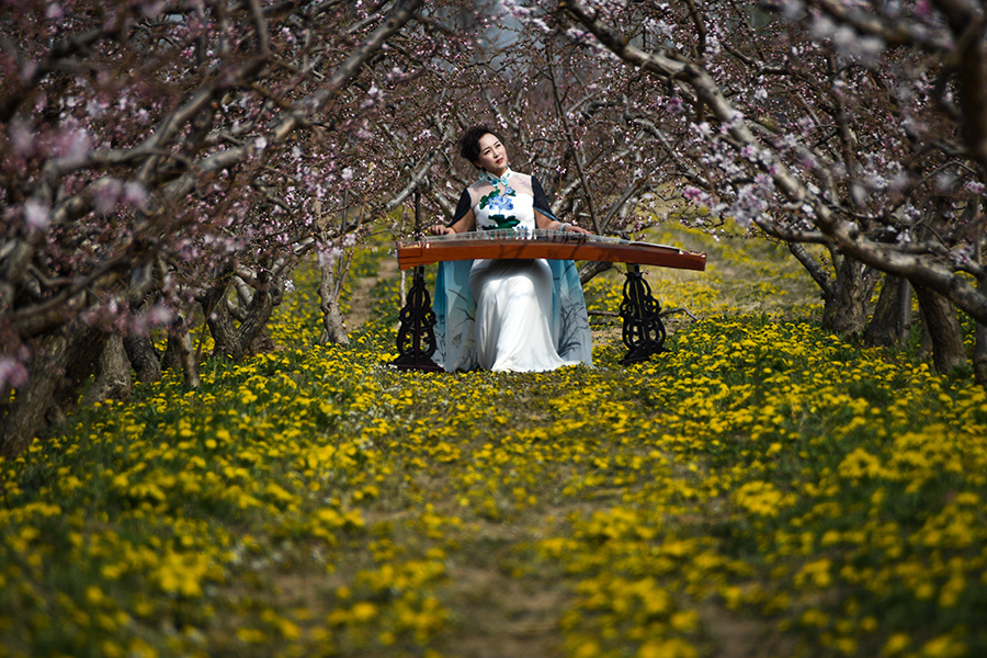 A Chinese guzheng musician plays the traditional Chinese string instrument beside the beautiful peach blossoms at Beixu village, Yicheng city, North China’s Shanxi province, April 4. [Photo by Hu Bo for chinadaily.com.cn]