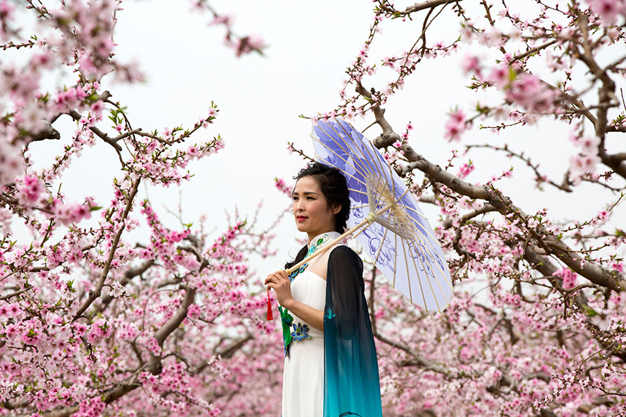 A Chinese guzheng musician poses for a photo among the beautiful peach blossoms at Beixu village, Yicheng city, North China’s Shanxi province, April 4.[Photo by Hu Bo for chinadaily.com.cn]