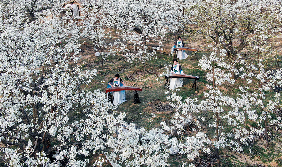 Several Chinese guzheng musicians gather at Wangbi village, Yicheng city, North China’s Shanxi province, to play the traditional Chinese string instrument among the beautiful pear blossoms on April 4. [Photo by Hu Bo for chinadaily.com.cn]