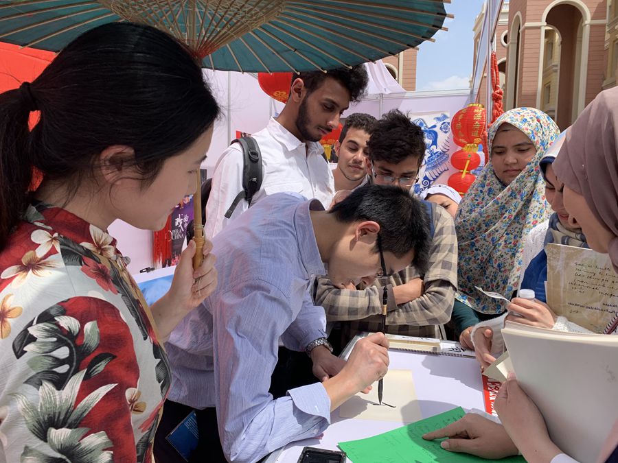 Egyptian students watch a demonstration of Chinese calligraphy on International Day at the British University in Egypt, on April 2, 2019. The China Cultural Center in Cairo provided various activities including a photo exhibition, a guzheng performance, calligraphy demonstrations and practice, hand-weaving, as well as books, films and brochures introducing China. [Photo/Chinaculture.org]