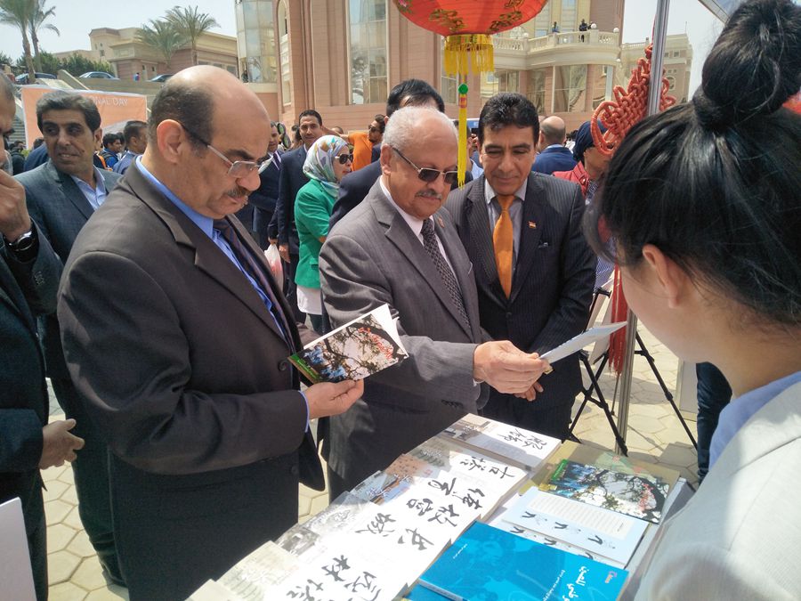 Ahmed Hamad, president of the British University of Egypt (second from left), and Hassan Ammar, secretary-general of the university, are pictured visiting the China booth at the university's International Day on April 2, 2019. [Photo/Chinaculture.org]