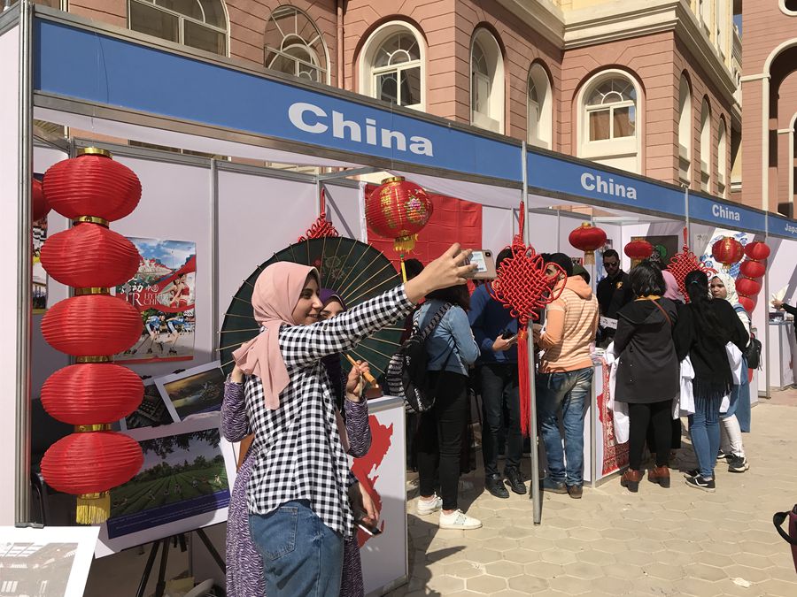Students pose for photos at booths introducing Chinese culture on International Day at the British University of Egypt, April 2, 2019. Red Chinese knots, lanterns, oil-paper umbrellas and cheongsams attracted many local students. [Photo/Chinaculture.org]