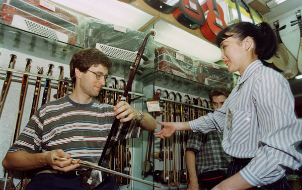 Bryan Dumm, cellist, tries a Chinese string instrument in Shanghai in 1998. [Photo provided to China Daily] |