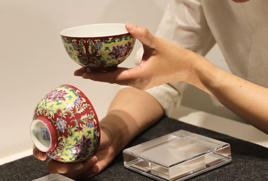 A staff member of auction house Christie's shows a pair of Qing Dynasty (1644-1911) porcelain bowls created during the reign of Emperor Yongzheng (1678-1735), at a media preview on April 11, 2019. The Christie's Hong Kong Spring Auctions 2019 will be held in Hong Kong from May 24 to 29. Those to go under the hammer include several treasured porcelain and handcraft works from ancient China, each estimated at more than HK$10 million ($1.2 million). [Photo/Xinhua]