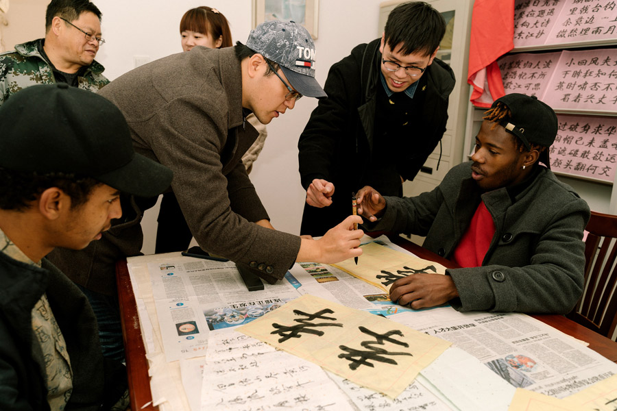 Lao Ma learns Chinese calligraphy in a community in Nantong, Jiangsu province. [PHOTO BY HUANG ZHE/FOR CHINA DAILY] |