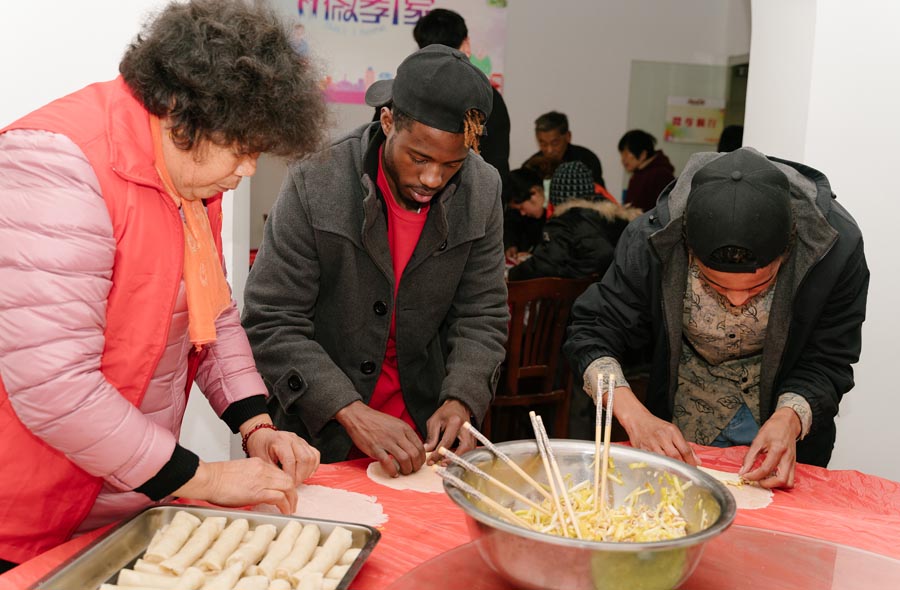 Lao Ma learns to make spring rolls. [PHOTO BY HUANG ZHE/FOR CHINA DAILY] |