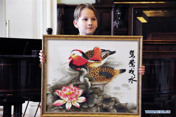 A boy shows an artwork during the 16th Chinese Bridge Chinese proficiency contest in University of Latvia in Riga, Latvia, on April 12, 2019. The 16th Chinese Bridge, an annual Chinese proficiency contest for school kids, college students and adult learners of Chinese, was held at the University of Latvia Friday and Saturday. [Photo/Xinhua] |