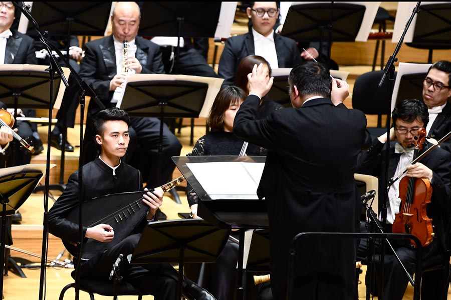 Wang Jinxin (first from left), a pipa player of the Xiamen Nanyin Troupe, collaborates in a concert with the China National Symphony Orchestra in Beijing in 2018. [Photo provided to China Daily] |