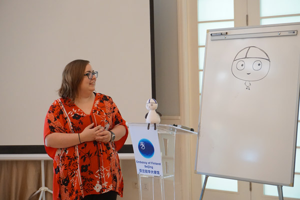 Karoliina Korhonen draws Matti, protagonist of her book, while interacting with Chinese readers in Beijing on April 14, 2019. [Photo by Li Ping/chinadaily.com.cn] |