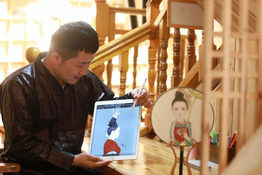 Lan Caisheng shows a drawing of a woman dressed in Dong ethnic clothes at the gallery in Zhaoxing Dong village, Liping county, Southwest China's Guizhou province, April 16, 2019. [Photo/Xinhua]