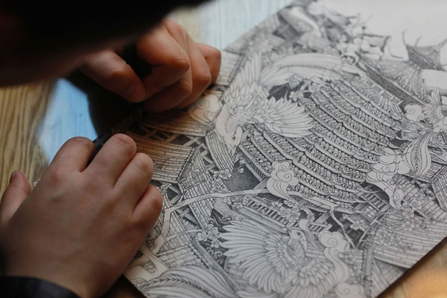 Lan Caisheng draws a Dong-style building at the illustration gallery in Zhaoxing Dong village, Liping county, Southwest China's Guizhou province, April 16, 2019. [Photo/Xinhua]