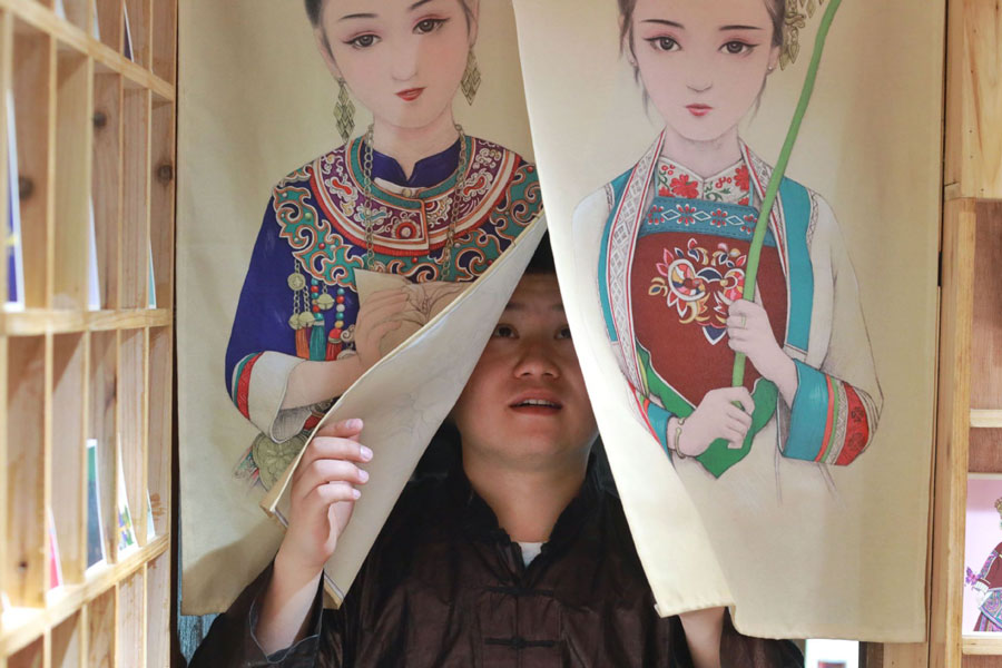 Lan Caisheng steps through curtains featuring his drawings in Zhaoxing Dong village, Liping county, Southwest China's Guizhou province, April 16, 2019. [Photo/Xinhua]