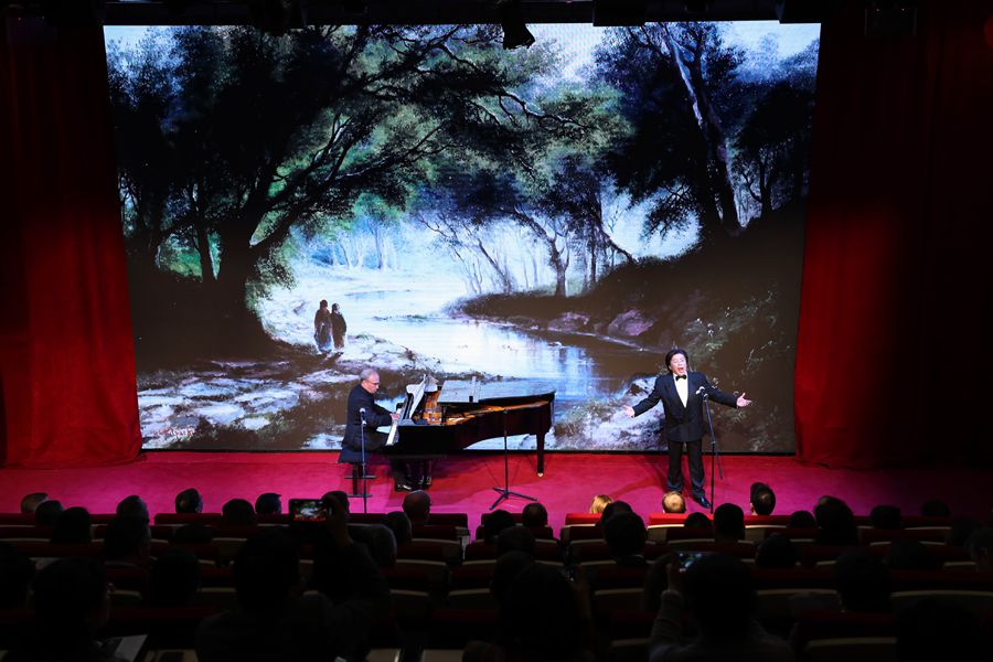 Tenor Wang Tiemin (R) performs during the China-Belarus Friendship Concert at the China Cultural Center in Brussels, Belgium, on April 18, 2019. Musicians from China and Belarus staged a dozen of performances during the China-Belarus Friendship Concert in Brussels on Thursday. [Photo/Xinhua]