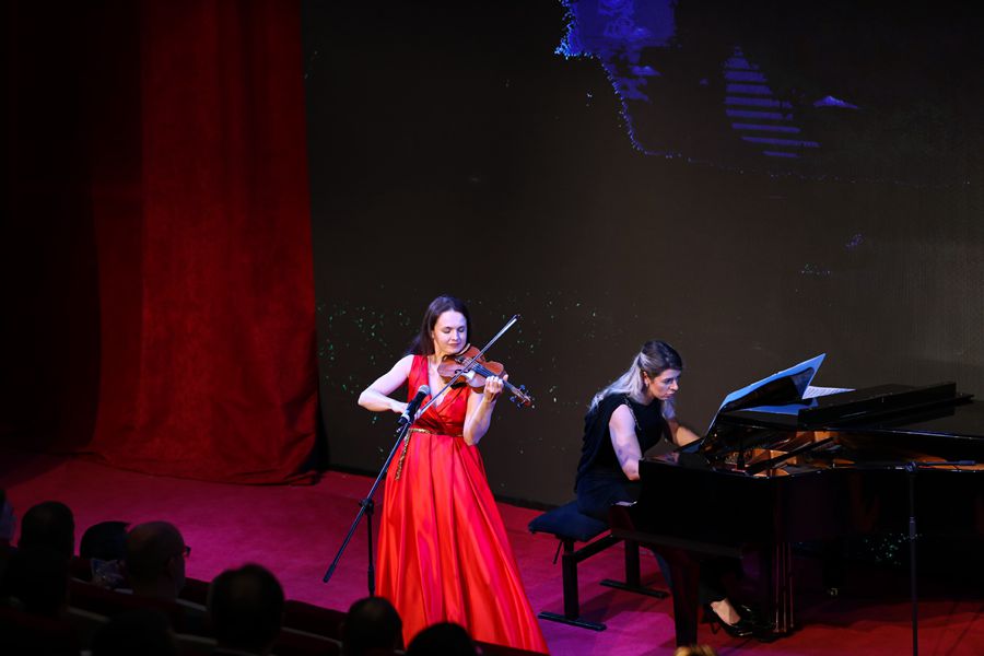 Violinist Yuliya Lebedenko (L) performs during the China-Belarus Friendship Concert at the China Cultural Center in Brussels, Belgium, on April 18, 2019. Musicians from China and Belarus staged a dozen of performances during the China-Belarus Friendship Concert in Brussels on Thursday. [Photo/Xinhua]