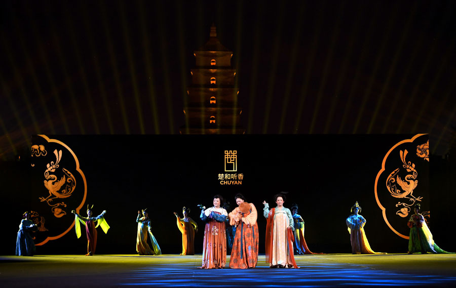 Models wear Chinese-style clothes at the opening ceremony of the International Fashion Week 2019 at Big Wild Goose Pagoda (Dayan Ta) square in Xi'an, Northwest China's Shaanxi province, on April 18, 2019. [Photo/Xinhua]