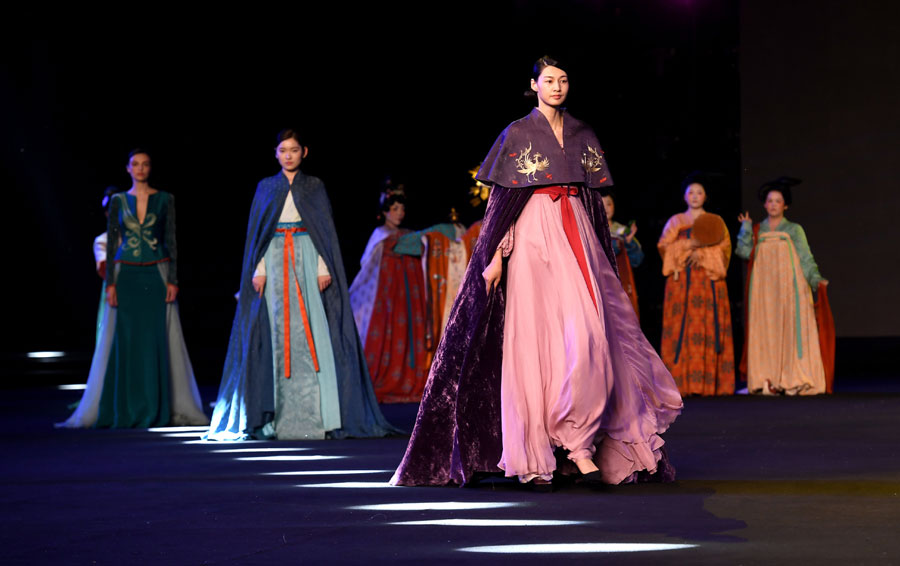 Models wear Chinese-style clothes at the opening ceremony of the International Fashion Week 2019 at Big Wild Goose Pagoda (Dayan Ta) square in Xi'an, Northwest China's Shaanxi province, on April 18, 2019. [Photo/Xinhua]