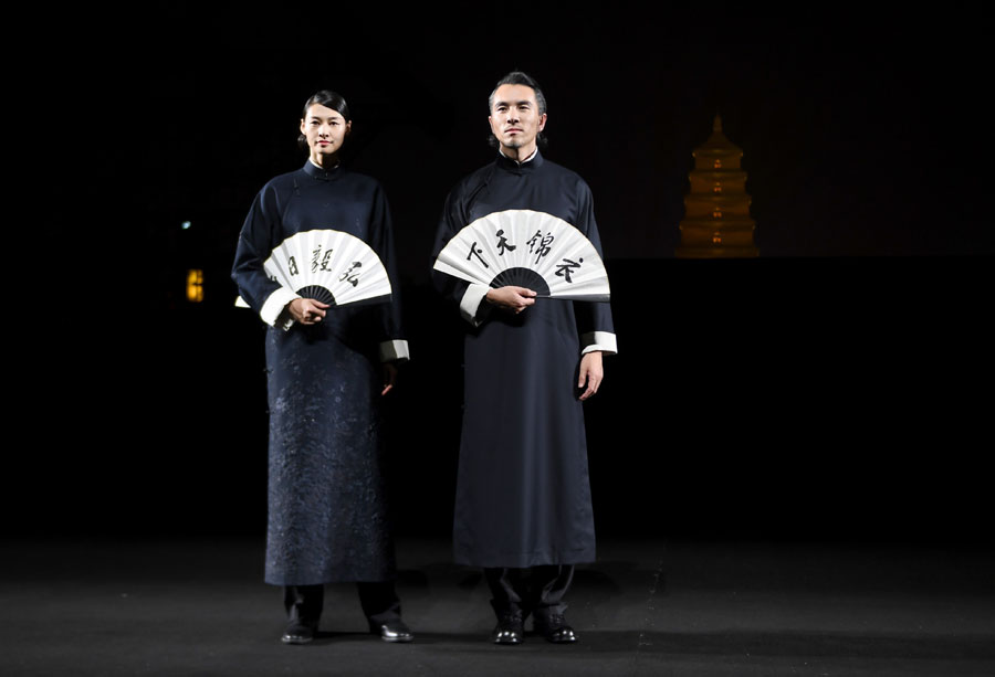 Models wear Chinese-style clothes at the opening ceremony of the International Fashion Week 2019 at Big Wild Goose Pagoda (Dayan Ta) square in Xi'an, Northwest China's Shaanxi province, on April 18, 2019. [Photo/Xinhua]