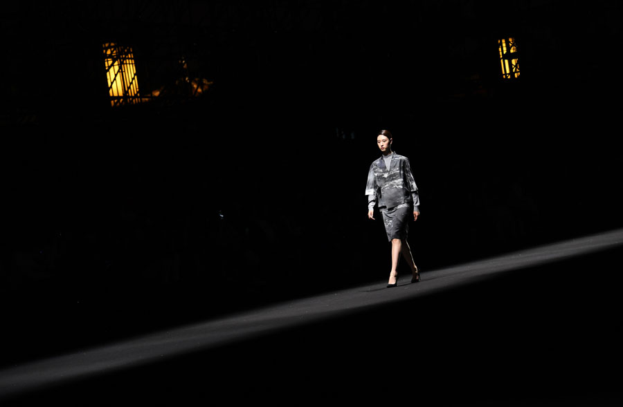 Models wear Chinese-style clothes at the opening ceremony of the International Fashion Week 2019 at Big Wild Goose Pagoda (Dayan Ta) square in Xi'an, Northwest China's Shaanxi province, on April 18, 2019. [Photo/Xinhua]