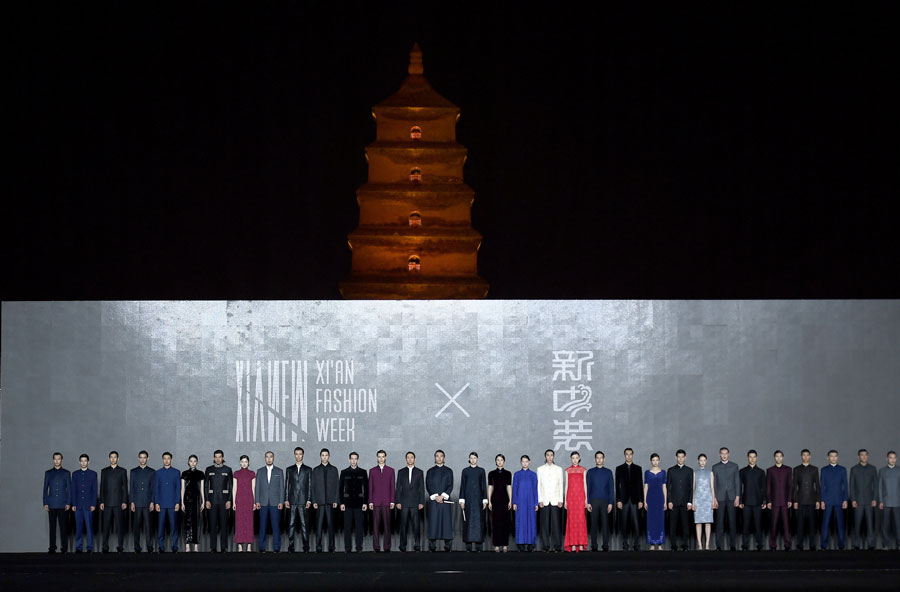 Models wear Chinese-style clothes at the opening ceremony of the International Fashion Week 2019 at Big Wild Goose Pagoda (Dayan Ta) square in Xi'an, Northwest China's Shaanxi province, on April 18, 2019. [Photo/Xinhua]