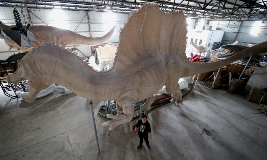 A life-sized spinosaurus statue by Zhao Chuang.[Photo by Chen Zebing/China Daily] |
